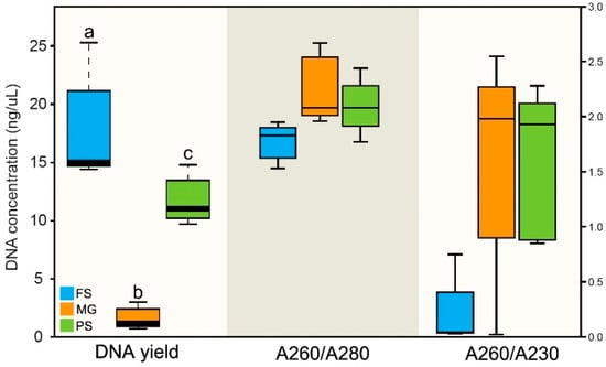 Comparison of DNA yields and quality between three extraction kits. DNA was eluted in a volume of 100 μL for all three kits and qualified by the ratios of A260/A280 and A260/A230. Median values are indicated by the solid line within each box, and the box extends to upper and lower quartile values. Different letters above the box indicate they are statistically different (p < 0.05/0.01).