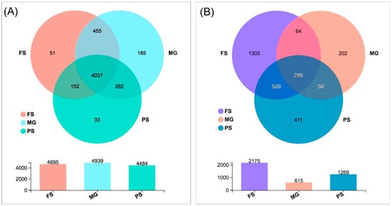 Venn diagram showing the number of shared and unique bacterial (A) and eukaryotic (B) OTUs among the samples extracted using the FS, MG, and PS kit.