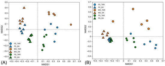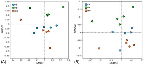 Nonmetric multidimensional scaling ordination of eukaryotic communities detected by two primer sets using the FS, PS and MG kits based on Bray–Curtis distances (A) and unweighted UniFrac phylogenetic distances (B).
