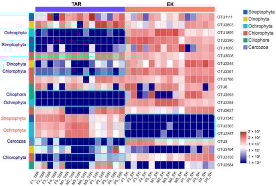 Raw data were processed following the standard procedures of Majorbio (Shanghai, China) as described in Li et al. [30]. Briefly, paired-end reads were quality-filtered by Trimmomatic and merged by FLASH [31,32]. UCHIME was used to identify and remove chimeric sequences [33]. Operational taxonomic units (OTUs) were clustered using UPARSE version 7.1 (http://drive5.com/uparse/ (accessed on 27 February 2019)) according to 97% similarity [34]. Taxonomic classification of OTUs were performed using the Silva (release 138) 16S rRNA database and the PR2 18S rRNA gene database, respectively. After filtering the unclassified domain OTUs and singletons, metazoa, and fungi sequences, all analyses were performed on randomly rarefied subsamples (n = 33,726 sequences for 16S; n = 21,079 sequences for 18S).