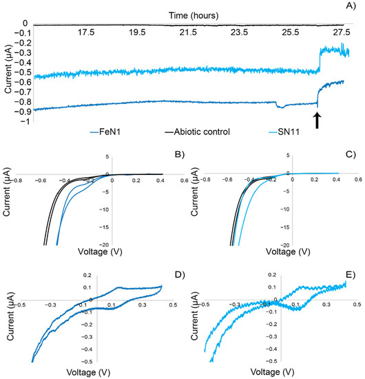 Electrochemical characterization experiments were carried out to confirm the ability of the Idiomarina strains to perform extracellular electron uptake. Using chronoamperometry, which measures current over time at a controlled redox potential, strains FeN1 and SN11 were tested for electrochemical properties. Chronoamperometry experiments showed that both SN11 and FeN1 sustained cathodic current production (negative currents) in the ITO-plated bioreactors compared to the abiotic control (Figure 2). Strain FeN1 showed a consistent current production of −0.5 µA, whereas SN11 sustained a current of −0.8–0.9 µA (negative currents indicative of electron uptake). Antimycin A, an inhibitor of cellular respiration through inhibition of cellular ubiquinone and cytochrome c interactions, was used to demonstrate the biological nature of cathodic current production. Current in biological reactors decreased upon the addition of Antimycin A (Figure 2). The abiotic control was not affected by the addition of Antimycin A and showed only background current production (~0.01 µA) in the duration of the experiments (Figure 2). Cyclic voltammetry demonstrated the relationship between current and voltage for each strain and demonstrated a distinct increase in cathodic (negative) current around −100 mV vs. SHE (Figure 2B,C). Non-turnover CVs supported subtle differences in the strains (Figure 2D,E). Specifically, the mid-point potentials measured for redox active features corresponding to the turnover electron uptake feature varied from −106.5 ± 7 mV vs. SHE for SN11 to −122 ± 12 mV vs. SHE for FeN1.