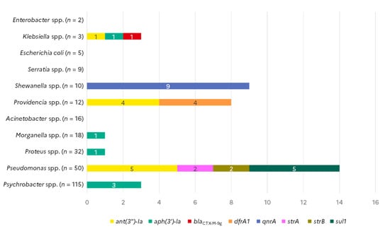Occurrence of antimicrobial resistance genes in Gram-negative isolates from seafood (N = 268).