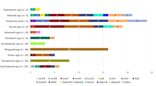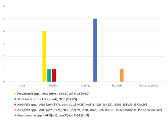 Out of the 268 strains tested, 76 (28.4%) gave a positive signal either for ARG (n = 27) or for MGE markers (n = 61), but only 12 carried both ARGs and MGEs (Figure 4). Among these 12 isolates, five Pseudomonas spp. isolated from shrimps harboured sul1 and ant(3″)-Ia genes associated with intI1, while four Providencia spp. isolates collected from shellfish harboured the ant(3″)-Ia and drfA1 genes together with intI2. Two Klebsiella, one isolated from shellfish and one K. oxytoca isolated from flat fish, simultaneously harboured ARGs as well as multiple IS elements and at least one plasmid marker. One of the qnrA-positive Shewanella spp. isolate was also found positive for IS43210.