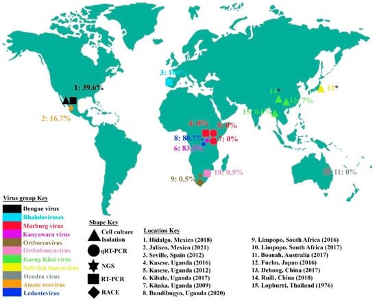 Locations from which bat ectoparasites for virus characterization were collected. The proportions of ectoparasites or ectoparasite pools found positive for the virus or virus family under study are also indicated, and virus or virus families are color-coded. The five differently shaped points show the different methods used for virus identification, including cell culture isolation, quantitative real-time PCR, reverse transcriptase PCR, next-generation sequencing and rapid amplification of cDNA ends. For the locations with an asterisk (*), the virus prevalence is indeterminate. The year for each study is also indicated.