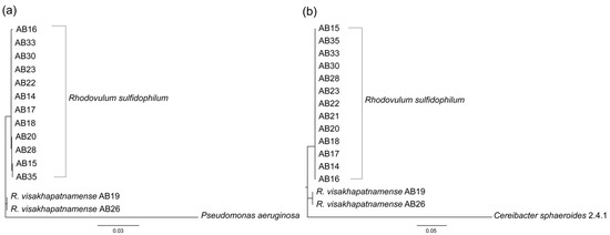 - Srinivas, T.; Kumar, P.A.; Sasikala, C.; Ramana, C.V.; Imhoff, J.F. Rhodovulum visakhapatnamense sp. nov. Int. J. Syst. Evol. Microbiol. 2007, 57, 1762–1764. [Google Scholar] [CrossRef][Green Version]
