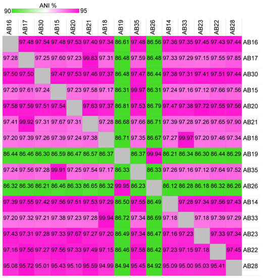 Heatmap showing average nucleotide identities (ANI) values from pairwise comparisons of the 15 Woods Hole isolates. ANI values were calculated using JSpeciesWSd [22] and visualized as a heatmap using Morpheus (Morpheus, https://software.broadinstitute.org/morpheus (accessed on 3 February 2022).