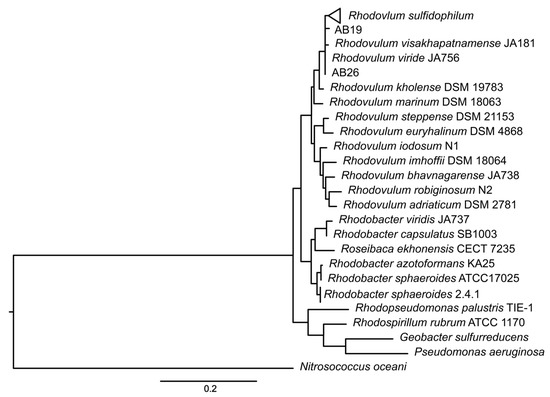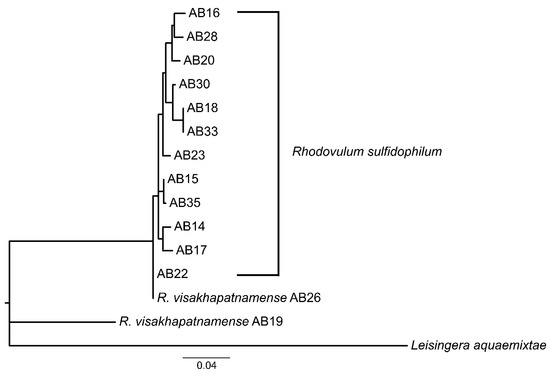 16S phylogenetic tree showing the new taxonomic assignment of strain AB19 and strain AB26 as Rhodovulum visakhapatnamense. Tree constructed by maximum-likelihood method using the Kimura-2 parameter model [26], tested by bootstrapping (500 resamplings) in MEGA11 [23].