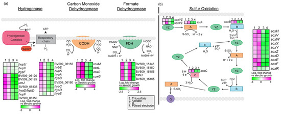 Genes involved in oxidation of inorganic compounds as a source of reducing power and their expression analysis via RNASeq. (a) nickel-dependent hydrogenase, carbon monoxide dehydrogenase, and formate dehydrogenase and their expression based on RNASeq. (b) sulfur oxidation pathway [33] and expression of the putative genes based on RNASeq. Heatmaps describe expression of four modes of metabolism (thiosulfate, acetate, H2, and pEEU) compared to aerobic growth. (a) CODH (carbon monoxide dehydrogenase), FDH (formate dehydrogenase), CO (carbon monoxide), HCOO− (formate) (b) Q (quinone pool).