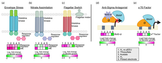 Expression analysis of significantly upregulated environmental responses such as envelope stress (a) nitrate assimilation (b) and flagellar switch (c) under pEEU compared to photoautotrophy with H2 (growth condition 1). Heatmaps also describe expression of transcription regulators anti-sigma antagonist (d) and sigma 70 factor (e) under four modes of metabolism (thiosulfate, acetate, H2, and pEEU) compared to aerobic growth.