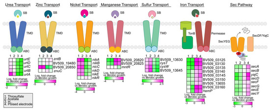 Expression analysis of transport systems in strain AB26. The Sec pathway genes are all upregulated during pEEU, which supports the need for protein export into the periplasmic space to facilitate extracellular electron transport. Heatmaps describe expression of four modes of metabolism (thiosulfate, acetate, H2, and pEEU) compared to aerobic growth. SB (substrate binding domain), TMD (transmembrane domain), ABC (ATP cassette binding domain).