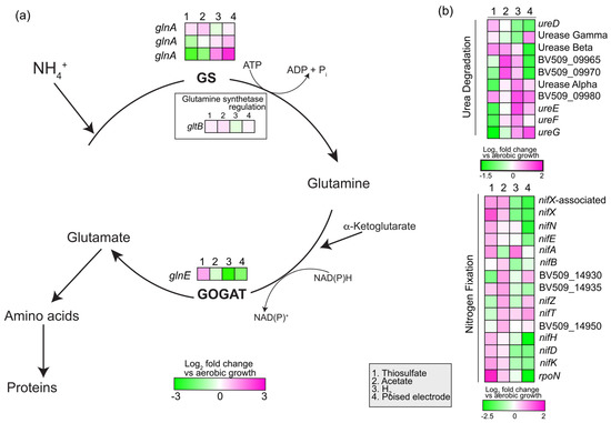 Strain AB26 uses the glutamine synthetase and glutamate synthase for ammonia assimilation in the cell. Strain AB26 genome contains two ammonia transporters, three glutamine synthetases, and a glutamine–synthetase adenyltransferase to regulate activity of glutamine–synthetases. Strain AB26 also encodes genes to convert urea to ammonia (BV509_09920-BV50-0995, Figure 7). Strain AB26 genome contains structural genes for a single molybdenum nitrogenase (BV509_14955-BV509_14965), assembly and cofactor genes, and the nitrogen fixation-specific sigma factor RpoN to fix nitrogen during anaerobic growth (Figure 7). During pEEU, one glutamine synthetase is highly upregulated (BV509_16830, log2fold change ~2.5, p < 0.0001), a second glutamine synthetase is slightly upregulated (BV509_16820, log2fold change ~0.75, p < 0.001; Figure 7a), and both are downregulated during photoheterotrophic growth compared to aerobic growth. Conversely, during pEEU, the glutamate synthase is downregulated as compared to aerobic growth (Figure 7a).