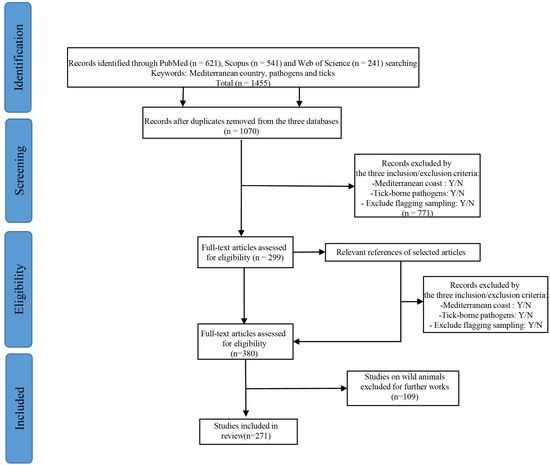 All articles published in English in international journals indexed by PubMed, Scopus and Web of Science were considered (Figure 1). The date range was from 1 January 2000 through 31 February 2021. We used keywords for each country of the Mediterranean Basin, classified in alphabetical order: Albania OR Algeria OR Bosnia-Herzegovina OR Cyprus OR Croatia OR Egypt OR France OR Greece OR Israel OR Italy OR Libya OR Malta OR Monaco OR Montenegro OR Morocco OR Palestine OR Slovenia OR Spain OR Tunisia OR Turkey AND Pathogens AND Ticks, with the option “all fields” to recover articles in which search items appeared in the title, abstract and keywords. First, all papers considered to be “grey” literature, such as literature reviews, case studies, manuscripts and abstracts of posters from conferences and guides from relevant organizations, were excluded. We also discarded clinical descriptions of disease and diagnosis in humans and animals. We selected all papers focusing on the distribution and circulation of tick-borne pathogens and their vectors. We focused on studies dealing with the distribution of these pathogens and ticks in the countries of the Mediterranean Basin and their islands. Second, we excluded duplicate and inaccessible articles (due to language or unavailable full text). We reviewed the titles and abstracts and applied inclusion/exclusion criteria on 1070 articles. Filtering was carried out by responding to the following questions: