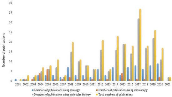 Number of publications through the years (2000–February 2021). The total number is indicated in yellow, and the other colors indicate the number of publications according to the detection method used (serology; microscopy; molecular biology).