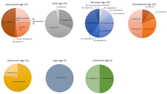 In all, 35 tick species from seven genera found on domestic animals in the Mediterranean Basin were positive for TBPs. Out of the seven genera, six belonged to the hard ticks (Ixodidae): Amblyomma, Dermacentor, Haemaphysalis, Hyalomma, Ixodes and Rhipicephalus. These genera are widely distributed in this region. The last genus, which was collected in Algeria and Egypt, represents the soft ticks (Argasidae): Argas (Table S1). The diversity of tick species positive for TBPs varies between these genera (Figure 4).