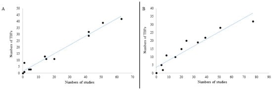 In addition to changes in the amount of data available depending on the year, we can also note variability of these data according to their geographic origin. In total, 271 publications and 20 countries of the Mediterranean Basin were considered in this review. The mean number of publications per country was about 13, and the number of publications varied from 0 to 76, depending on the country (Figure 3).