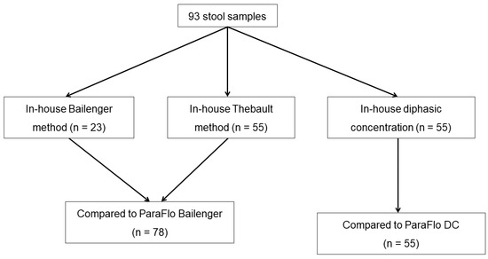Of the 93 stool samples included in the study, 23 samples could be analyzed with the in-house and commercial Bailenger methods. For 55 samples, the Thebault method was performed instead of the Bailenger concentration method; thus, this technique was compared to ParaFlo® Bailenger. Another 55 samples could be analyzed with the in-house and ParaFlo® diphasic concentration methods. Among the 93 samples, 5 were analyzed with both Bailenger methods and both DC methods, and 35 were analyzed using the Thebault, ParaFlo® Bailenger, and both DC methods. The total number of samples tested with each concentration technique is depicted in Figure 1.