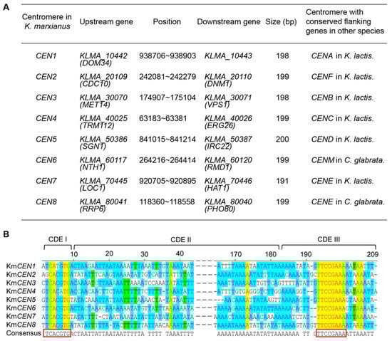 The positions and sequences of centromeres in K. marxianus. (A) The positions of centromeres in K. marxianus. The positions of centromeres refer to the positions in the genome of DMKU3-1042 []. (B) Alignments of centromeres in K. marxianus. The consensus sequences are in the red box. Color setup of the alignments: blue for conservative, green for similar, yellow for identical. The alignments were performed by Vector NTI (Thermo Fisher Scientific, Waltham, MA, USA).