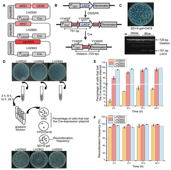 To investigate whether the leaky expression of Cre was sufficient to induce recombination between loxP sites, LHZ620 was transformed into LHP719 in which the ORF of LAC4 was flanked by two loxP sites (Figure 2B). Transformants were selected on the SD + X-gal + G418 plate, X-gal was hydrolyzed into blue precipitates by β-galactosidase, which was encoded by the LAC4 gene []. As shown in Figure 2C, blue and white colonies were formed on the plate and subjected to colony PCR. As expected, the LAC4 gene was deleted by Cre recombinase in white colonies (Figure 2C). In blue colonies, bands corresponding to the deletion of LAC4 and the presence of intact LAC4 were both detected. The results indicated that LAC4 genes were gradually deleted by Cre recombinase during growth and that led to the mixture of blue and white cells in one colony. Since the prolonged presence of the Cre plasmid interfered with the genetic stability of host cells, LHP620 was optimized to facilitate the rapid loss of plasmids during growth in the unselective medium. To this end, CEN5 and ARS1 in the LHP620 were replaced by a sole ARS1 of K. marxianus to obtain LHZ892, or by a panARS element to obtain LHZ893 (Figure 2A). A panARS element is a short ARS sequence identified in K. lactis. PanARS allows episomal plasmid maintenance in diverse species of budding yeast. However, loss frequencies per generation of panARS-based plasmids ranged from 5% to 20% [], suggesting panARS-based plasmids would not be as stable as centromere-based plasmids during propagation in K. marxianus (Table 1). LHZ620, LHZ892 and LHZ893 were transformed into LHP719 separately. Colonies formed on SD + X-gal + G418 plates were mixed and grown in the unselective YPD medium for indicated times. Cells were then spread onto YPD and YPD + G418 plates to calculate the percentage of cells that lost the Cre-expressing plasmid or spread onto SD + X-gal plates to calculate the recombinant frequency (Figure 2D). After growing in YPD for 24 h, the percentage of cells that lost LHZ620 was 24%, and the percentage of cells that lost LHZ892 and LHZ893 were 97% and 100%, respectively. Notably, the percentage of cells that lost LHZ893 reached 96% after only 2 h growth in YPD (Figure 2E). Therefore, panARS-based LHZ893 was an unstable plasmid during propagation and that facilitated the rapid clearance of Cre-plasmid from the host. The recombination frequency was calculated by the percentage of white colonies. After growing in YPD, the highest recombination frequency of cells transformed with LHZ620 was 97%, and those of cells transformed with LHZ892 and LHZ893 were 99% (Figure 2F). LHZ893 promoted efficient recombination between loxP sites, and it could be quickly removed from the cells by growing in the unselective medium. Therefore, LHZ893 containing Cre recombinase behind a leaky LAC4 promoter and an unstable panARS element was recognized as a novel and effective Cre-expressing plasmid in K. marxianus and was applied in the following studies.