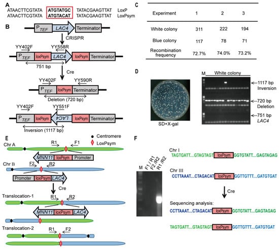 The Cre-loxP system is a useful tool for site-specific genetic manipulation, which is widely used to achieve deletion, insertion, duplication, transposition, inversion or translocation in bacteria [], yeasts [], plants [,], insects [] and mammals []. The Cre-loxP system consists of two components, including a pair of 34-bp loxP sites and the Cre recombinase of the P1 bacteriophage []. Cre catalyzes the recombination between loxP sites, and the outcome of the recombination depends on the location and orientation of the loxP sites []. The Cre-loxP system does not require additional co-factors such as ATP or topoisomerase for efficient recombination [] and it can mediate recombination on many types of DNA, including linear, circular and superhelical DNA []. Therefore, the Cre-loxP system was successfully applied to a wide range of scenarios. For example, the system was used to remove selection markers for the recycling of markers, which facilitated the manipulation of target genes in multiple rounds []. The system was applied as a switch of gene activation and inactivation in transgenic animals []. Combinations of different Cre recombinases and multiple loxP site variants, such as symmetrical loxP (loxPsym), created multiple recombination events and expanded the application scope of this technique []. In the Synthetic Yeast Genome Project (Sc2.0 Project), ~4000 loxPsym sites were integrated into all sixteen synthetic chromosomes []. The SCRaMbLE (Synthetic Chromosome Rearrangement and Modification by loxP-mediated Evolution) technique was developed to produce numerous genome rearrangements in the synthetic genome of Sc2.0 and artificially accelerate the evolution of yeast strains by this technique [].