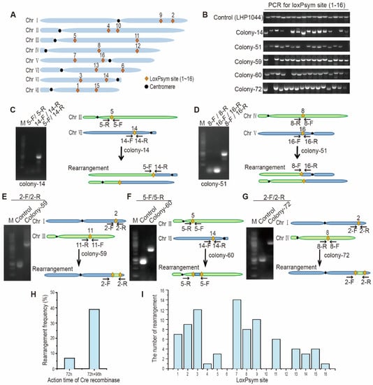 To evaluate the efficiency of rearrangements between multiple loxPsym sites, LHP1044 containing 16 loxPsym sites distributed among eight chromosomes was constructed (Figure 4A). LHP1044 was transformed with LHZ893 and transformants were grown on the YPD + G418 plate for 72 h. Transformants were then grown in YPD for 12 h and spread onto YPD plates. Seventy-two colonies were randomly selected and subjected to PCR using 16 pairs of primers corresponding to 16 loxPsym sites. As a control, PCR of LHP1044 produced 16 bands for 16 sites. Among 72 colonies, 5 colonies failed to obtain the expected band at one or more sites, suggesting rearrangement occurred at these sites (Figure 4B). Colony 14 contained a translocation between Chr III (site 5) and Chr VII (site 14), as a PCR product was obtained by using primers of site 5 and 14 (Figure 4C). Colony 51 contained a translocation between Chr IV (site 8) and Chr V (site 16), as a PCR product was obtained by using primers of site 8 and 16 (Figure 4D). Both translocations occurred through loxPsym sites. In the other three colonies, primer pairs at certain sites produced bands bigger than expected, suggesting that an insertion occurred in the sites (Figure 4E–G). In colony 59, a fragment adjacent to loxPsym site 11 in Chr III was inserted into the position at loxPsym site 2 in Chr I. In colony 60, a fragment adjacent to loxPsym site 14 in Chr VII was inserted into the position at loxPsym site 5 in Chr III. In colony 72, a fragment adjacent to loxPsym site 8 in Chr IV was inserted into the position at loxPsym site 2 in Chr I (Figure 4E–G). The results indicated that multiple loxPsym across the genome could mediate large-scale translocations and cause insertions of small fragments around the site. However, the recombination frequency was only 6.9% (5 colonies/72 colonies). To improve the recombination frequency, the action time of Cre recombinase was extended by growing on the selective YPD + G418 plate for an extra 96 h and the frequency increased to 38.9% (28 colonies/72 colonies) (Figure 4H). Among a total of 144 colonies identified, 33 colonies exhibited rearrangements at certain sites. In these colonies, no rearrangement was detected at site 6, 10 and 12, suggesting these sites were not prone to loxPsym-mediated recombination (Figure 4I). Meanwhile, 14, 12 and 10 events of rearrangement occurred at site 7, 3 and 9, respectively, suggesting these sites were hotspots for recombination (Figure 4I). The high-order structure of the chromatin around loxPsym sites or surrounding genes might determine the bias for the recombination [].