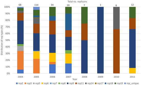 The rep9 family (n = 77), followed by rep3 (n = 45) and rep11 (n = 39), were the most prevalent rep-families in both E. faecalis and E. faecium for all the years tested (Table 2, Table 3, Table 4 and Table 5). Abundance of rep-families varied over the years, with the highest number of different rep-families detected in 2005 (n = 10) (Figure 1). The number of rep-families declined from the earlier years (2004–2007) to 2009, in which only one rep-family (rep9) was detected. The number of rep-families detected began to increase again in 2010 and 2011, in which two (rep11 and rep14) and four (rep6, rep9, rep11, rep19) different rep-families, respectively, were found (Figure 1).