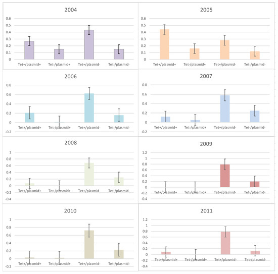 Frequency of tetracycline-susceptible and resistant enterococci with and without plasmid replicons from 2004 to 2011. Error bars reflect 95% confidence intervals.