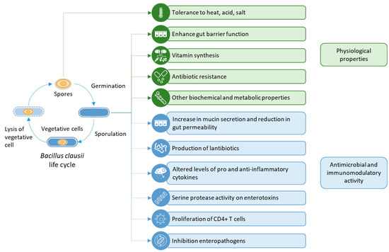 A summary of the physiological, antimicrobial, and immunomodulatory properties of Bacillus clausii.