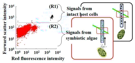 To detect and evaluate the intact P. bursaria host cells in a test sample, a microcapillary flow cytometer that was equipped with a green laser operating at 532 nm (MuseTM Cell Analyzer, Merck Millipore Corp., Burlington, MA, USA) was used, as described earlier [19,39]. P. bursaria fixed in 5% (v/v) formalin was analyzed at flow rates of 0.59 µL/s. Several optical properties of P. bursaria cells that passed through a rectangular capillary with a 100-µm round bore were analyzed. Forward scatter signals (forward scatter-height intensity) were collected to confirm the cell size. Simultaneously, chlorophyll fluorescence was detected in the red fluorescence channel using a 680/30 nm band-pass filter. In addition to the red fluorescence channel (red fluorescence intensity), a yellow fluorescence channel (576/28 nm band-pass filter) was simultaneously used. To obtain sufficient data, FCM measurements were repeated 3–20 times. Individual signals were extracted from the FCM data for each generated FCS3.0 file using FCSExtract utility ver. 1.02 (Stowers Institute for Medical Research, Kansas City, MO, USA). The data were re-analyzed using standard spreadsheet software (Excel, Microsoft Corp., Redmond, WA, USA). In microcapillary FCM, the intact P. bursaria host cells as target cells pass through a 100-μm-wide capillary for analysis, which allows passage of their paramecia [19,39]. If the P. bursaria host cells are not disrupted during the measurement, information about them is obtained [39]. Conversely, disruption of the host cell prior to analysis allows collection of information on endosymbiotic algae that are released from the crushed host cells [40]. If the FCM data of P. bursaria are expressed in a scatter plot of forward scatter intensity vs. red fluorescence intensity, two distinct populations are detected (R1, representing the intact P. bursaria cells, and R2, representing the endosymbionts that are released from the broken P. bursaria cells) (Figure 1), as described earlier [39].