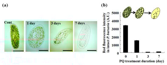The mechanism of PQ toxicity in relation to photosynthesis is described in Figure 6a. Chlorophyll absorbs light energy in the light reaction of photosynthesis. After excitation, the electron transfer chain is involved in a series of redox reactions. Using electrons that are generated by this electron transfer chain, PQ reduces oxygen molecules, which leads to the production of superoxide as one of the reactive oxygen species [52] (Figure 6a). This induces oxidative stress and cytotoxicity, such as the decrease in the number of endosymbionts in the P. bursaria cell (Figure 2a). The flow cytometer that was used in the current study detected signals that were derived from the endosymbiotic algae in the P. bursaria host cell by focusing on the red fluorescence (Figure 2b) [19,39,40]. The intensity of red fluorescence (Figure 2b) was largely consistent with the changes in the number of endosymbiotic algae that were observed using microscopy (Figure 2a).