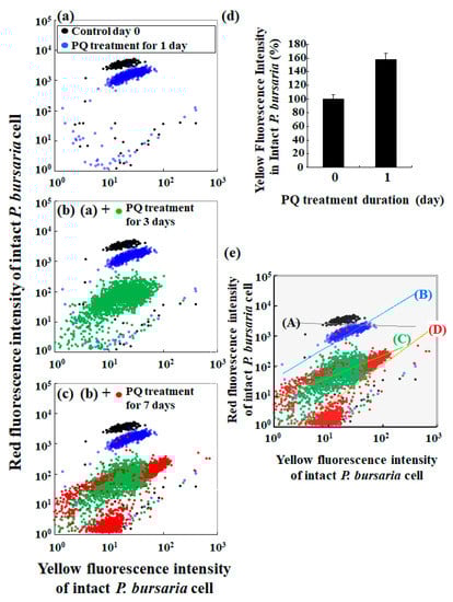 Figure 3 shows scatter plots of the red fluorescence intensity and the corresponding yellow fluorescence intensity. The yellow fluorescence of algae is related to chlorophyll integrity [45,46,47,48], while the red fluorescence directly reflects the number of algae and an algal population size [14,49,50,51]. Comparison of the scatter plot pattern of untreated controls and those of cells that were treated with PQ revealed changes after 1 d of PQ treatment (Figure 3a). Furthermore, the plot pattern was clearly different from that for the control condition, depending on the duration of the PQ treatment (Figure 3a–c). Specifically, the yellow fluorescence intensity of the cells that were treated with PQ for 1 d was notably greater than that of the control cells (Figure 3d). However, the increase in yellow fluorescence intensity was not pronounced after 3–7 d of PQ treatment when compared to the yellow fluorescence intensity in cells after 1 d of PQ treatment (data not shown).