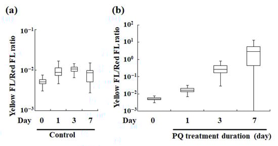 The yellow/red fluorescence intensity ratios of the PQ-treated and untreated (control) cells were compared (Figure 4b). The ratio increased even after 1 d of PQ treatment compared with that in the control. Further, the ratio value notably increased with the lengthening of the PQ treatment. As noted in Section 3.2.1, the vertical axis representing the yellow/red fluorescence intensity ratio in the box-and-whisker diagram, but not the yellow or red fluorescence, is independent of the number of endosymbiotic algae in a P. bursaria host cell. Therefore, the yellow/red fluorescence intensity ratio represents the intensity of cellular stress that is experienced by an individual endosymbiont cell. The data indicated that the viability of the endosymbiotic algae deteriorated depending on the duration of the PQ treatment.