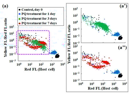 Scatter plots of the red fluorescence intensity (Red FL) vs. the ratio of yellow fluorescence intensity (Yellow FL) to the corresponding Red FL of P. bursaria treated or untreated (control, day 0) with PQ (0.1 μg/mL). (a) Scatter plots for the control and PQ-treated (1–7 d) cells. Panel (a’) shows all scatter plots except for the data for the 7 d PQ treatment, and panel (a’’) shows all scatter plots except for the data for the 3 d PQ treatment.