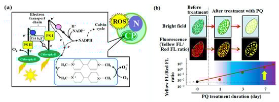 The effect of the herbicide PQ on photosynthesis and the evaluation of endosymbiotic algal vitality in P. bursaria using the yellow/red fluorescence intensity ratio. (a) Mechanism of photosynthesis-related PQ toxicity and the associated reactive oxygen species (ROS) production [52]. The acronyms PS, Cyt, N, and CP, respectively, denote photosystem, cytochrome, algal nucleus, and chloroplast. (b) Conceptual diagram of the devised method for the evaluation of the endosymbiotic algal vitality in P. bursaria cells using the yellow/red fluorescence intensity ratio as a stress index.