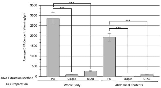 Comparison of DNA concentrations obtained by different DNA extraction methods. Three different DNA extraction methods were investigated: Phenol–chloroform (PC), Qiagen DNeasy Blood & Tissues Kit (Qiagen), and Cetyltrimethylammonium bromide (CTAB). A total of 22 samples were tested with each method, 11 of which used the whole body of the tick while the other 11 used only the abdominal contents. The average DNA concentration obtained using each method is shown here and separated by tick preparation method (whole body versus abdominal contents only). Statistical significance (p ≤ 0.05) is denoted by asterisks.