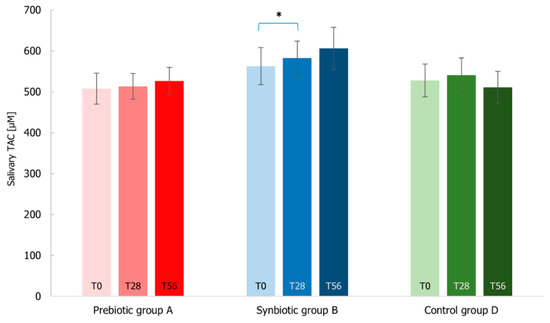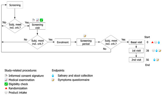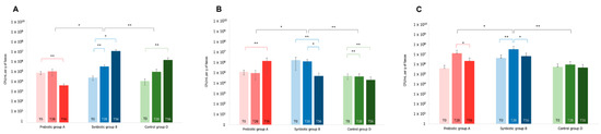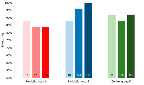 - Probiotic and prebiotic (synbiotic) formulation (Group 2): 1 × 109 CFU L. acidophilus PBS066 (30 mg as lyophilized), 1 × 109 CFU L. plantarum PBS067 (12 mg as lyophilized), 1 × 109 CFU B. animalis spp. lactis BL050 (30 mg as lyophilized) (all the strains are from the private collection of Roelmi HPC, Origgio, Italy), with 50 mg FOS (fructo-oligosaccharides with a degree of polymerization between 3–5) and 50 mg inulin (with a degree of polymerization of 10) (for a total of 100 mg of fibers), and common excipients used in formulations