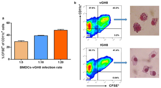 On day 8 of culture, BMDCs were collected and seeded in a 24-well plate at a density of 1 × 106/mL. For sorting experiments, BMDCs were seeded in 100 mm Petri dishes. Cells were exposed to live (vGH8) or glutaraldehyde-fixed stationary phase L. infantum promastigotes (fGH8) (wherever applicable parasites were previously stained with CFSE) at a ratio of infection 20:1 followed by gentle pipetting to facilitate contact among BMDCs and parasites. Four hours later, non-phagocytosed parasites were removed by gently washing, fresh complete culture medium was added to the wells, and cells were cultured for a total of 24 h. Evaluation of BMDCs infection was conducted with flow cytometry through determination of CFSE+ BMDCs. Otherwise, cells were Giemsa stained and the infection of BMDCs was determined microscopically.