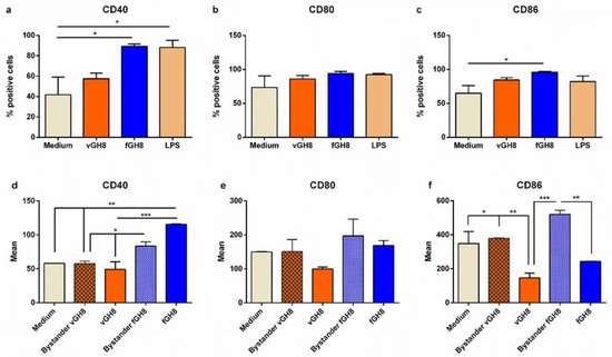 Evaluation of maturation of L. infantum-infected BMDCs and fixed parasite-harboring BMDCs. Populations expressing: (a) CD40, (b) CD80 and (c) CD86 co-stimulatory molecules were detected by flow cytometry. (d–f) The surface co-stimulatory molecules were further analyzed in bystander and L. infantum-infected BMDCs and fixed parasite-harboring BMDCs expressed as Mean (mean fluorescence). The mean ± SD of three independent experiments is shown (*: p < 0.05, ** p < 0.01, ***: p < 0.001).