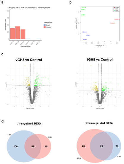 Identification of differentially expressed genes (DEGs) in Leishmania-infected BMDCs (vGH8) and BMDCs harboring fixed parasites (fGH8): (a) Mapping rates of RNA-seq samples in L. infantum genome; (b) Multidimensional scaling (MDS) plot of DEGs in Leishmania-infected BMDCs (vGH8), BMDCs harboring fixed parasites (fGH8) and naïve BMDCs (Control); (c) Volcano plots showing differential expression analysis between vGH8 versus Control and fGH8 versus Control BMDCs. Up- and downregulated genes (FDR < 0.05) are depicted with green and yellow, respectively; (d) Venn diagrams portraying the number of exclusively and common up- (left) and downregulated (right) genes for each comparison.