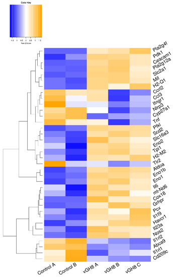 Unsupervised hierarchical clustering based on expression of metabolism-related DEGs between vGH8 versus Control BMDCs.