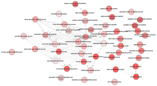We next used Gene Ontology (GO) systems of classification to decipher how the cellular responses evoked against infection. This analysis resulted in 93 enriched GO terms and applied to upregulated genes only (File S2A). REVIGO was used to further reduce these terms to a non-redundant set of 47 representative terms (Figure 7). Results revealed significant enrichment of terms associated with pyruvate, nucleotide and amino acid metabolic processes as well as the response to hypoxia and nitric oxide biosynthetic process. Moreover, KEGG pathway analysis revealed only five pathways that were related to “HIF-1 signaling pathway”, “Glycolysis/Gluconeogenesis”, “Biosynthesis of amino acids”, “Central carbon metabolism in cancer” and “Carbon metabolism” (Table 2; Figures S4 and S5).