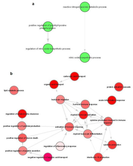 Gene ontology (GO) enrichment analysis of DEGs in fixed parasites-harboring BMDCs summarized by REVIGO. Graph shows biological processes enriched (parents GO terms) in: (a) upregulated and (b) downregulated genes (Benjamini-Hochberg p-value < 0.01). Highly similar GO terms are linked by edges. Bubble color indicates the user-provided p-value. GO terms that are highly similar are linked by edges in the graph, where the degree of similarity is indicated by the line width [45].