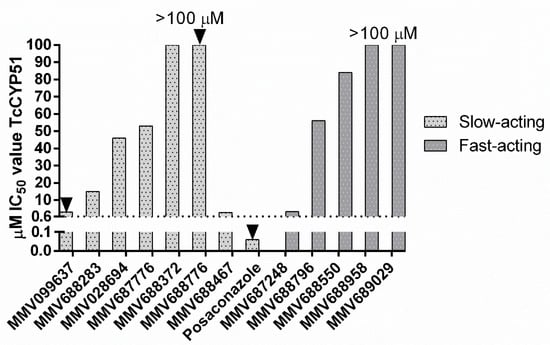 IC50 values of slow and fast-acting compounds active against TcCYP51. Where IC50 values reach 100 µM, the IC50 value is >100 µM. Arrows denote compounds with a sub-efficacious Emax following 48 h incubation. MMV099637 = 70% Emax; MMV688776 = 88%, Posaconazole = 73% Emax. Dashed line = 10× the IC50 value of posaconazole as a cut off for CYP51 inhibition.