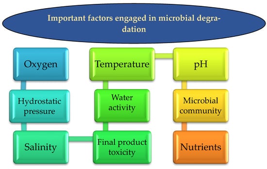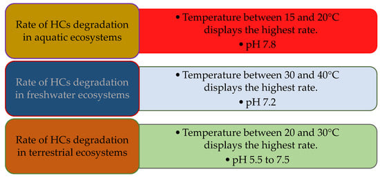 The microbial efficiency in the biodegradation process of HCs depends on multiple environmental factors (Figure 2). In the next subsections, potential factors will be discussed in detail to what extent they can impact the microorganism functionalities.