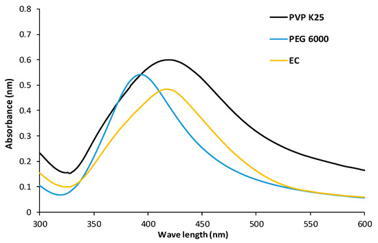 Figure 1 shows the UV–VIS spectra of the different AgNPs-stabilized particles. Generally, AgNPs, with their pronounced surface plasmon resonance effect, revealed strong absorption bands in the visible region. The AgNPs-PEG, AgNPs-EC, and AgNPs-PVP spectra displayed λmax values of 397, 419, and 420 nm, respectively, demonstrating the successful preparation of the NPs and the spherical morphology of the obtained particles [37,51,64]. It was reported by Pai et al. that AgNPs with a spherical morphology have only one absorption peak compared with other shapes, such as triangles and disks, both of which show more than one peak [48]. In addition, one absorption band for each type of NPs delineates the symmetrical particle distribution [65]. The observed redshift in the spectra of both the AgNPs-EC and AgNPs-PVP also revealed larger particles compared with AgNPs-PEG, as previously reported [66].