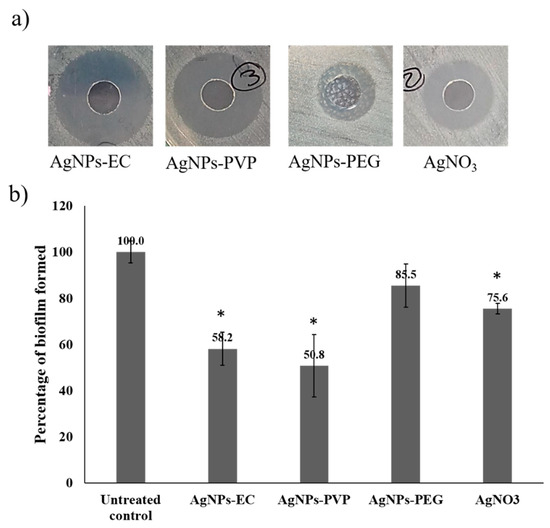 The effect of these AgNPs on E. coli biofilm formation was tested with a microtiter plate assay. The results showed that treatment of cells with subinhibitory concentrations of AgNPs (5 µg mL−1) significantly reduced biofilm formation in most cases. As shown in Figure 3b, AgNPs-EC treatment reduced biofilm formation to 58.2% (p-value = 0.01) compared to untreated control wells (100%). In contrast, AgNPs-PVP and biofilm inhibition were 50.8±% (p-value = 0.01), indicating that both nanoformulations had potent antibiofilm activities. Samples treated with AgNO3 and AgNPs-PEG revealed biofilm formation that reached 75.6% (p-value = 0.02) and 85.5% (p-value = 0.07), respectively, compared to the untreated control samples.