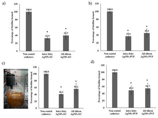 Effect of catheter coating on biofilm formation. (a) The percentage of biofilm formation on catheters coated with AgNPs-EC under static conditions. (b) Biofilms formed on catheters coated with AgNPs-PVP under static conditions. Panels (c,d) show the effect of surface coating on biofilm formation under flowing conditions. Columns show the mean values of 3 experiments ± S.D. * Denotes p-value < 0.05 as tested by unpaired t-test compared with the untreated control samples. The image on trace (c) shows the flowing conditions with a pump rate of 20 mL min−1. Two hundred ml of E. coli culture suspension was stirred to prevent bacterial sedimentation, and the experiment was conducted in an incubator at a temperature of 37 ± 0.5 °C.