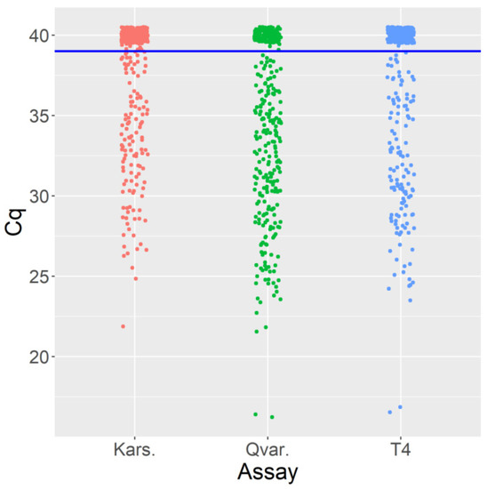 Cq values distribution plot of 185 clinical corneal samples with Kars assay (red), Qvar assay (green), and T4 assay (blue). The individual Cq values of each assay are plotted to show an overall Cq pattern and the range of the Cq values. The Cq of negative samples were arbitrarily set at 40 for visualization purpose.