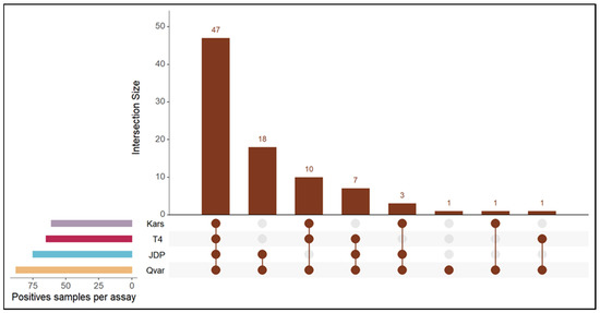 Upset graph of the assays presenting the size of the intersections (cardinality) of the positive samples with JDP (turquoise), Qvar (orange), Kars (purple), and T4 (red) assays.