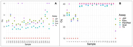 Cq values of positive corneal culture samples (A), and from direct clinical corneal samples (B). With a Cq cut off of 37 in (B), all methods (JDP, Qvar, Kars, and T4) present the same results, except for one sample that was not detected by the T4 assay and was found to be a T3 by sequencing. Dots represent the JDP positive samples with Cq values set at 10, while the negative samples are illustrated with dots at a Cq value of 40.