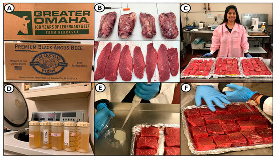 Inoculation of mixed strains of cultures (i.e., preparation was described earlier; Figure 1D) was performed as follows: (a) the appropriate amount of beef pieces for a particular trial were placed on foil-lined trays and held in the refrigerator until inoculation; (b) ~150 μL of the resuspended/concentrated inoculum mixture was applied by micropipette onto the surface of each beef slice; (c) the inoculum was rubbed over the surface with a double-gloved finger by another person who was assisting; (d) the pieces were then turned over and the process repeated on the other side; (e) the tray(s) of inoculated beef were then placed in a refrigerator 5 °C for at least 30 min to allow attachment (Figure 1E,F).
